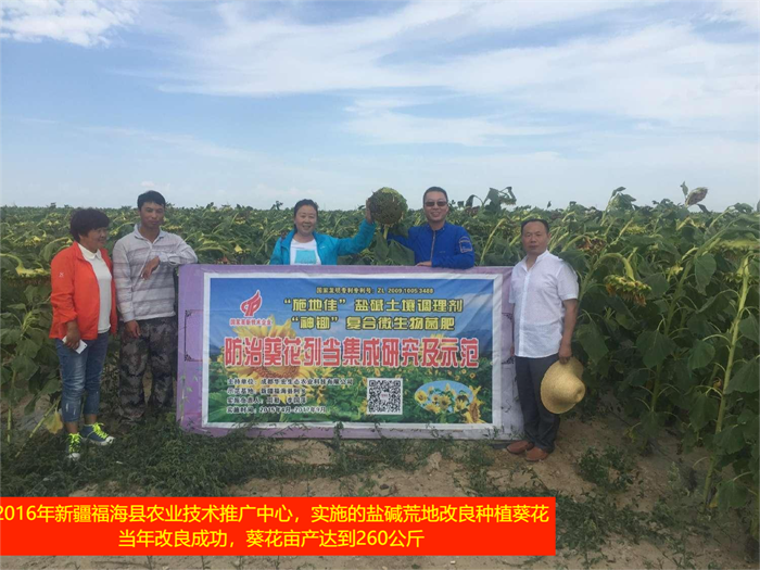 2016年新疆福海縣農(nóng)業(yè)技術(shù)推廣中心,實(shí)施的鹽堿荒地改良種植葵花當(dāng)年改良成功,葵花畝產(chǎn)達(dá)到260公斤