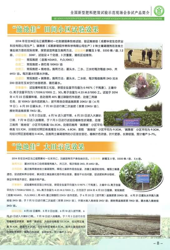 2014年8月21日,“2014年新型肥料肥效試驗現(xiàn)場培訓在甘肅張掖市召開”。來自全國各省、市相關技術人員共計100余人參加培訓。成都華宏生態(tài)農(nóng)業(yè)科技有限公司總經(jīng)理李智強,攜公司高管參加了這次培訓。與會人員還參觀了全國農(nóng)技推廣服務中心在全國選出的七個新型肥料品種在張掖市的試驗示范。成都華宏生態(tài)農(nóng)業(yè)科技有限公司自主研發(fā)的“施地佳”土壤調(diào)理劑也被安排在甘州區(qū)烏江鎮(zhèn)賈寨村一社趙建國的承包地試驗,試驗作物是玉米。根據(jù)田間記載:4月22日播種,5月2日出苗,6月10進入拔節(jié)期,6月25日進入大喇叭口區(qū)期。7月18日進入抽穗期。于7月3日進行示范田植株性狀調(diào)查,施用“施地佳”土壤調(diào)理劑,大田平均株高135.5cm,較對照區(qū)增高10.1cm,莖粗為9.3cm,均較對照區(qū)增粗0.5cm,施用“施地佳”土壤調(diào)理劑后,示范田苗齊苗壯、植株葉色濃綠,長勢較強。預計增產(chǎn)5—6%。