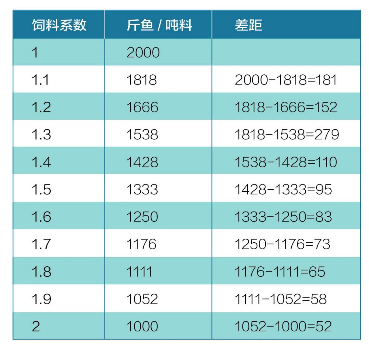 相同重量飼料,不同飼料系數(shù)情況下生產(chǎn)成魚產(chǎn)量也存在差距。從這個(gè)表可以看出,同樣的2000斤飼料,當(dāng)飼料系數(shù)為1時(shí),可以產(chǎn)出2000斤成魚;但飼料系數(shù)增加到2時(shí),產(chǎn)出的魚只有1000斤。