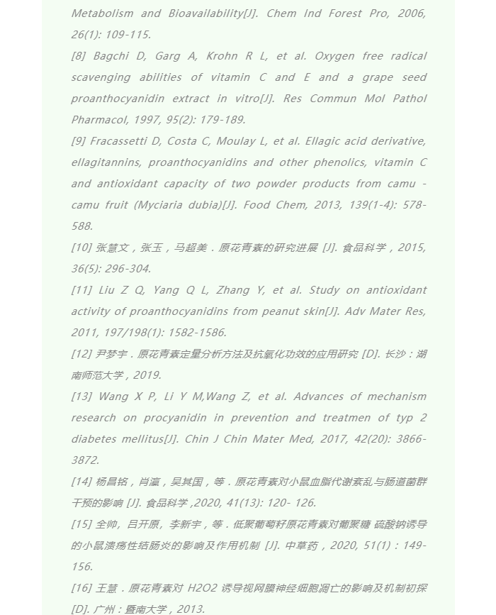 ? 其他生物活性研究: 除了抗氧化外,國(guó)內(nèi)外學(xué)者對(duì)原花青素的活性展開(kāi)了大量研究,主要包括降血脂、抗炎、抗動(dòng)脈粥樣硬化、抗癌、調(diào)節(jié)血糖、神經(jīng)系統(tǒng)性疾病、抗腹瀉等方面 [13-17]。其中原花青素在抗腹瀉上應(yīng)用成果最為突出。2012 年,美國(guó)食品和藥品監(jiān)督管理局(FDA)批準(zhǔn)Fulyzaq(商品名為 Crofelemer)用于治療 AIDS 患者的腹瀉癥狀;Crofelemer 提取自大戟科龍血巴豆的紅色乳膠,是一種平均分子量約為2200 ku的多種原花青素單體的隨機(jī)聚合的產(chǎn)物 [18]