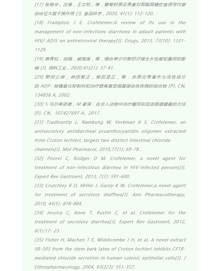 需要說(shuō)明的是,Crofelemer(SP-303)是聚合度為 3~30、平均分子量 2 200 ku 的原花青素。而 Fisher 等 [35] 采用來(lái)源相同、未分離純化、主要成分占 SP-303 質(zhì)量 67%、平均分子量為 3 000 ku 的 SB-303 與 SP-303 對(duì)比的結(jié)果顯示,SB-303 也具有抗分泌腹瀉的活性,雖然效果略弱于 SP-303,但提取工藝和成本大幅減少,這為對(duì)純度要求不太高的領(lǐng)域(如飼料)具有很高的開(kāi)發(fā)價(jià)值。